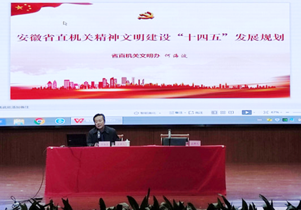 何海波主任详细解读了党的二十大报告中关于精神文明建设方面的相关内涵,并结合《安徽省直机关精神文明建设“十四五”规划》,从指导思想、基本原则、总体目标以及“十四五”时期发展重点任务等有关学校文明校园创建工作进行了专题理论宣讲。宣讲开始前,他对我校被省直机关精神文明建设活动委员会授予2020—2022年度省直机关文明校园荣誉称号表示由衷地祝贺,对我校“文明校园”创建工作给与了高度肯定。他指出,学校下一步要结合学校工作特点,落实立德树人根本任务,深化省直机关文明校园“六好”工作要求,加强全体教职员工和学生的社会公德、职业道德、家庭美德、个人品德建设,强化校园文明习惯养成,践行社会主义核心价值观,形成“举特教旗帜、聚特教民心、育特教新人、兴特教文化、展特教形象”的有特色的文明校园创建工作。