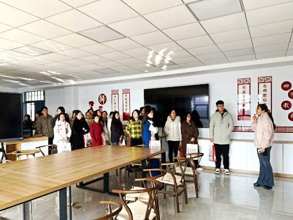 校园参观环节,教务处主任杜黎丽带领来校教师们分别参观了教师能力发展中心、名师工作坊、各专业实训室及部分专业作品展,向大家全面展示了学校的办学理念、师资队伍建设、专业建设和教科研成果。参观过程中,教师们对学校在专业实训室的先进设备和实训环境表示赞赏,并对名师工作坊中教师们的专业成长和教学创新给予了高度评价。