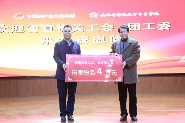 捐赠仪式上,李宗军主任代表省直机关工会、团工委向我校捐赠价值4万元的文体用品,校党委副书记、副校长汤俊峰代表我校接受捐赠并表示感谢。省直工委副书记温和等领导上台向我校5名优秀团干进行颁奖,向我校全国学联二十七大代表胡振田及部分学生送去了关心问候。